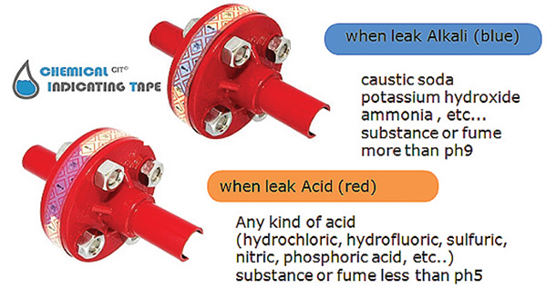 CTA’s chemical indicating tape is approved among industrial circles by ensuring long-distance checks, exact checks of leak points, detection of colorless and odorless fumes, and identification of acid and alkali. This product reduces concerns from such challenges in chemical substance management, as it is impossible to: sensor the very small amount of chemicals and fumes; or to identify when colorless and odorless; and impossible to identify the exact leak points. Moreover, it is very costly to use leak detector and measurement equipment, and CTA’s chemical indicating tape is easy to use, with competitive prices.