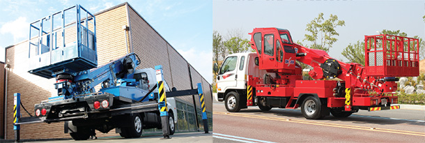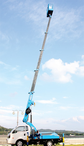 With a small swing angle of 250 degrees, it allows users to easily perform aerial works in urban areas and narrow alleyways. Utilizing locally made long-wheel base truck’s cabin chassis, the model offers a maximum working height of 18m. Its X-shaped main outrigger guarantees maximum stability with a horizontal / vertical automatic extension of 3.8m. By employing pentagonal boom and side pad-controlling device which were developed by in-house technology, the model minimizes the distortion of the boom caused by bucket rotation.