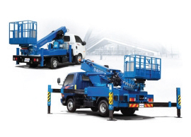 Utilizing locally made long-wheelbase truck’s cabin chassis, the model offers a maximum working height of 18m. Its X-shaped main outrigger guarantees maximum stability with a horizontal/vertical automatic extension of 3.8m. By employing pentagonal boom and side pad-controlling device which were developed by in-house technology, the model minimizes the distortion of the boom caused by bucket rotation.