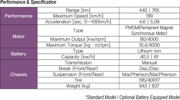 If you take a look at the performance of the R2, it can go as far as 765 km on a single charge at 60 km/h. This innovative range was made possible by its carbon fiber body that makes the vehicle lighter with its weight around 837kg and highcapacity battery pack of 81kWh when equipped with its optional battery. Also, its power-train features a Permanent Magnet Synchronous Motor (PMSM), and inverter, with a five-speed manual transmission, which enables dynamic driving at the level of super car with its explosive acceleration that can reach 100 km/h within 4.6 seconds. Its battery module, which was made by connecting barrel shaped battery cells in series/parallel, has been self-developed for its stability and high performance.
