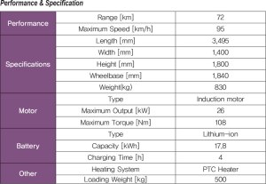 Its maximum output is 26kW, maximum torque, 108Nm and loading weight, up to 500 kg. Also, it has a 17.8kWh lithium-ion battery with 72 km of driving range on a single charge. The driving range, when nothing is loaded, can stretch up to about 100 km on a single charge and it lasts approximately four hours when fully charged.