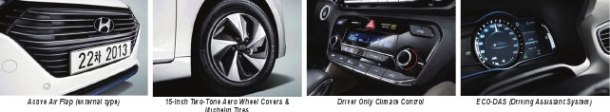 – 15-Inch Two-Tone Aero Wheel Covers & Michelin Tires: IONIQ’s low rolling resistance tires, specially designed in collaboration with Michelin, the global leader in tire technology, minimize running resistance and enhance fuel efficiency.