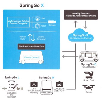 SpringGo C is a mobility platform for autonomous driving vehicles. The platform enables not only the conversion of production vehicles, but also the autonomous driving of variety of mobility, including the autonomous driving shuttle buses, carts, trucks, ships, special vehicles, and drones.