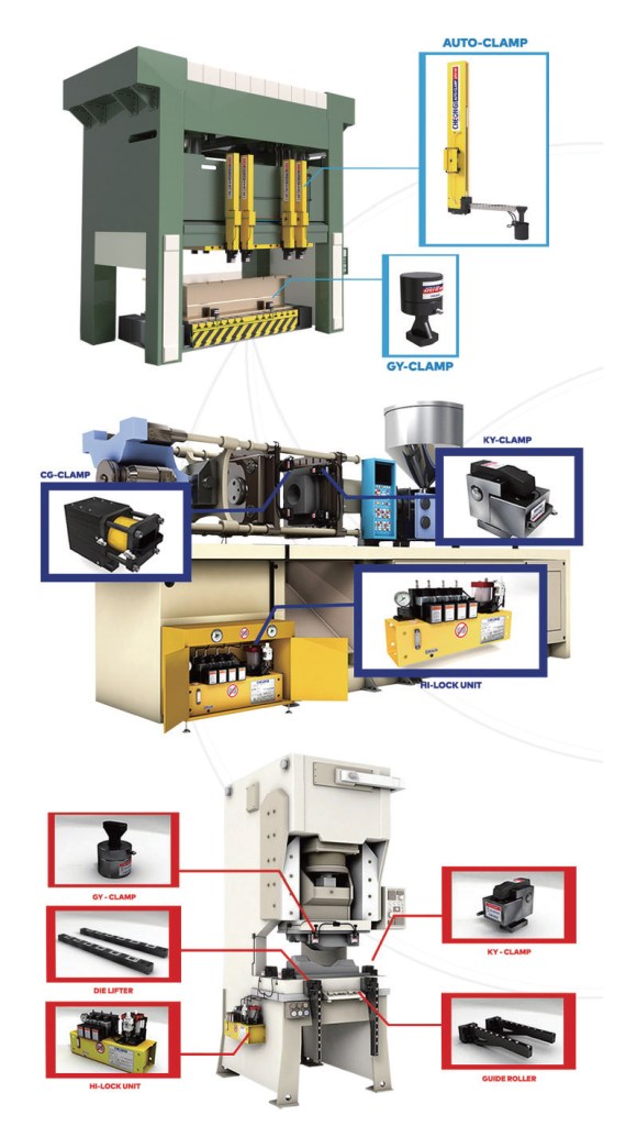 requires high levels of safety; Hi Clamp TK type applicable to medium and large injection molding; AFSY type whose safety and functionality are recognized in large press; Hi Clamp GY type suitable to home types that can be safely mounted on press molds; Hi Clamp TM type and Hi Clamp GS type suitable to standardized molds.