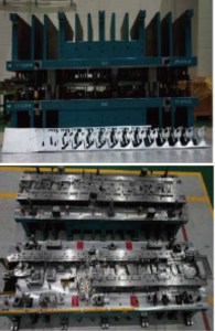This mold has advantages of cutting costs, saving labor costs and significantly improving the stability of work due to the characteristic of high productivity. It also has effects of suppressing the half-finished product inventory, reducing the mold preparatory set-up time, and facilitating production management. Due to the high productivity, it has the advantages of labor-cost saving and mass-production in a short time. On the other hand, its disadvantages are that the dimensional tolerance becomes strict when manufacturing, designing is difficult, and there is a concern that noise may be generated.
