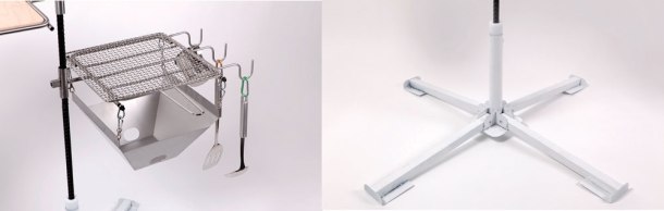 Treffer, a BBQ grill for camping, is easy to carry and assemble. It can be installed over a campfire on which to place or hang cooking utensils. It features a new type of rack shelf that enables one to adjust the height freely according to the position desired by the user, and it also can be used as a simple burner. Designed to offer excellent space utilization, durability, and mobility, it is a unique product not only domestically but in the global market.
