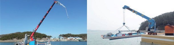 This product, mainly used in the abalone aquafarm, is a multipurpose articulated crane used for feeding, salvage of fishing net, kelp collection and abalone harvesting. This product has a multi-stage boom system and articulating outer boom with maximum lifting capacity and improved working radius based on the optimized design ranging from small to large vessels for responding to each aquafarm size and also is equipped with powerful hydraulic tongs enabling the precise operation, thereby demonstrating excellent capacity. This product is a vessel-dedicated crane equipped with components plated for preventing corrosion and various safety devices.