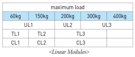 modules based on the standardized linear guide system can handle various loads from 10kg to 400kg.