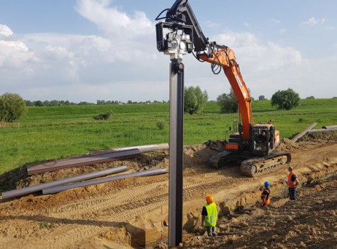 Vibro hammer is a kind of hydraulic attachment used to drive piles (poles) into soil to provide foundation support for buildings or other structures. Low maintenance costs are possible compared to cranes. Superior mobility is available for narrow spaces. Using excavator oil, it requires no extra power source. It rotates 360 degrees and the proven high quality rubber absorbs vibration. The special bearing can endure high-speed rotation.