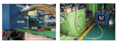 KASS oil purifier performs precision filtering of foreign material and moisture. This purifier transforms the disposed waste oil to usable oil of NAS 5 ~ 9 cleanness (New oil: NAS 8 cleanness).