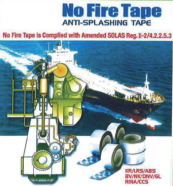 This tape is attached to the pipe flange connection, connector connection, various valve connections and main inner wall of the engine room. This product has a very important and high-quality function of flame retardance, which prevents burning in the event of fire. Also, conflagration can be blocked in advance by covering the gap between the pipe and connection part with the non-fire tape so that the fuel and oil cannot be sprayed when the fuel pipe is leaked. Therefore, according to the SOLAS RULE of the International Maritime Organization (IMO), this product must be applied to all pipe connections inside ship parts and cabins, and it is an essentially applied to the offshore structures and ships on condition of approval of the class society.