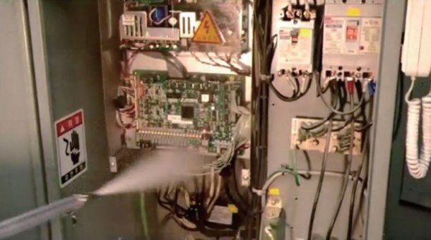 Dust can be removed without interrupting power supply within 35,000V. The PCB and the mounted electronic components are also damage proof. Excellent detergency and 5.2kg/cm2 spray power easily removes dirt between the electronic parts.