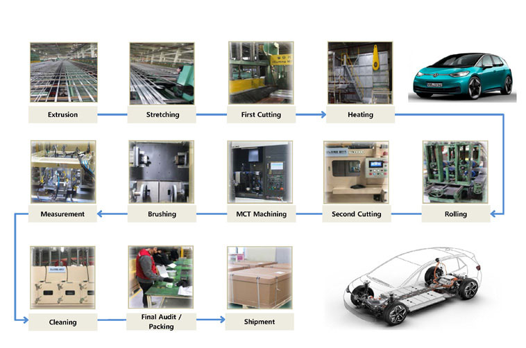 Daejoo Kores produces items such as battery housing & battery module case, for EVs, bumper beams, roof racks, guide rails, and swing doors based on its special technology and accumulated know-how of aluminum extrusion.