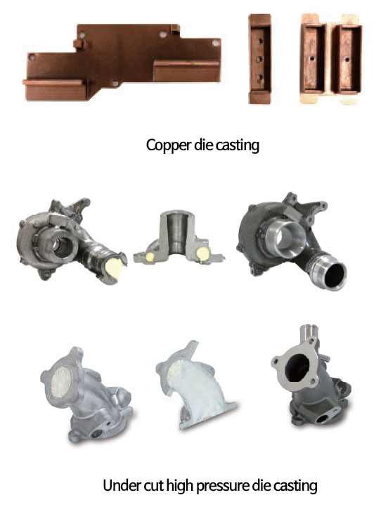 Those parts with aluminum-casting undercuts are produced from gravity castings by using sand cores.