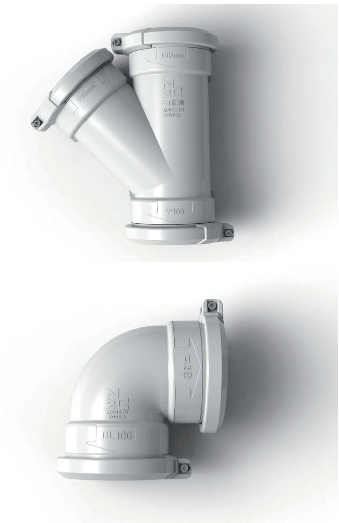 NC2 low-noise piping consists of a pipe made of special low noise and flame retardant materials, a joint pipe based on an innovative clamping method and a toilet elbow with a variable elastic nozzle.