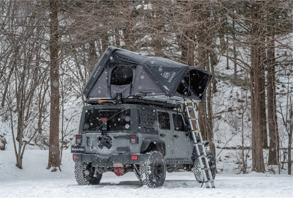 Using high-strength aluminum honeycomb material, it can support a weight of over 1,000kg and provides a spacious interior space where three adults or a family of two adults and two children can comfortably rest. An anti-theft lock is installed to safely store items inside the rooftop tent.