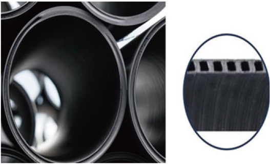 Double-wall pipe is made of a double-wall structure by extruding a high-density polyethylene (HDPE) mechanically. I-beam between the inner and outer tubes forms a central layer at regular intervals. Compressive strength is high, it is resistant to corrosion, and can be used semi-permanently.