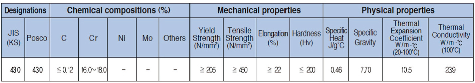Out of the entire 400 series, STS430, which is a typical ferrite stainless steel product, is especially outstanding in terms of corrosion and heat resistance and has low thermal expansion and deformation, making it easy for welding processing.