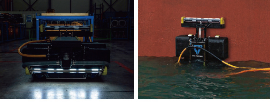 TAS GLOBAL has recently developed new technology to remove hull attachments by combining a robot’s underwater autonomous navigation technology and deep learning-based hull-structure analysis technology. Its ship hull cleaning ROV is the world’s only ROV that attaches strongly and gently to ships both underwater and on the surface of the water, and that can freely move and clean curved surfaces.