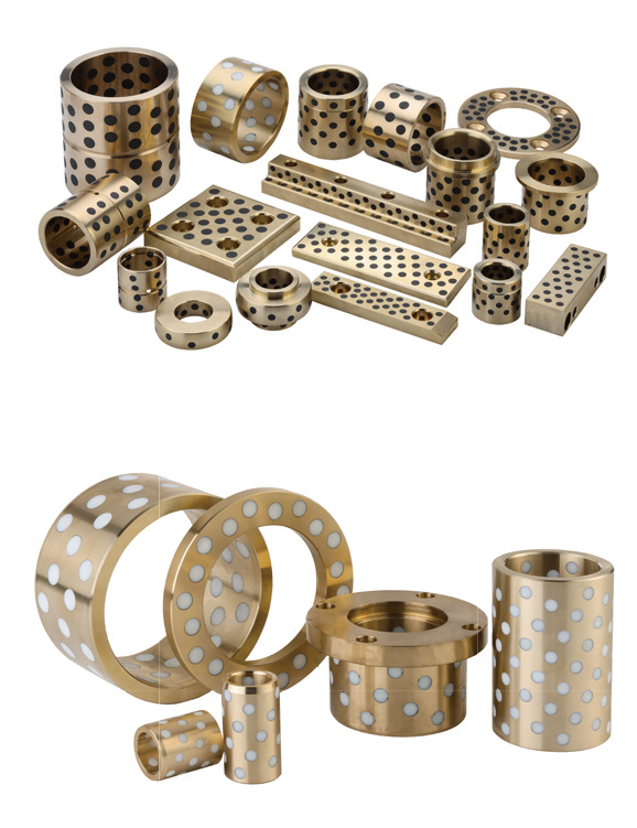 Brass oil-less bearing SGO #500 is a plain bearing with graphite plugged to base metal, brass. Fine particles of solid lubricant create lubrication film on the motion part, when friction occurs, and the bearing can achieve excellent self-lubrication and abrasion-resistance under dry-lubricating conditions.