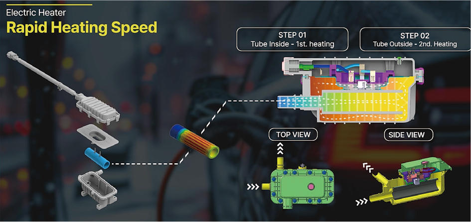 While warm-up heaters have been used before, INZI CONTROLS’ warm-up heater uses a cylindrical ceramic heating element to increase the warm-up speed. This shortens the cold start time and increases battery efficiency, thereby helping to extend the driving range of electric vehicles.