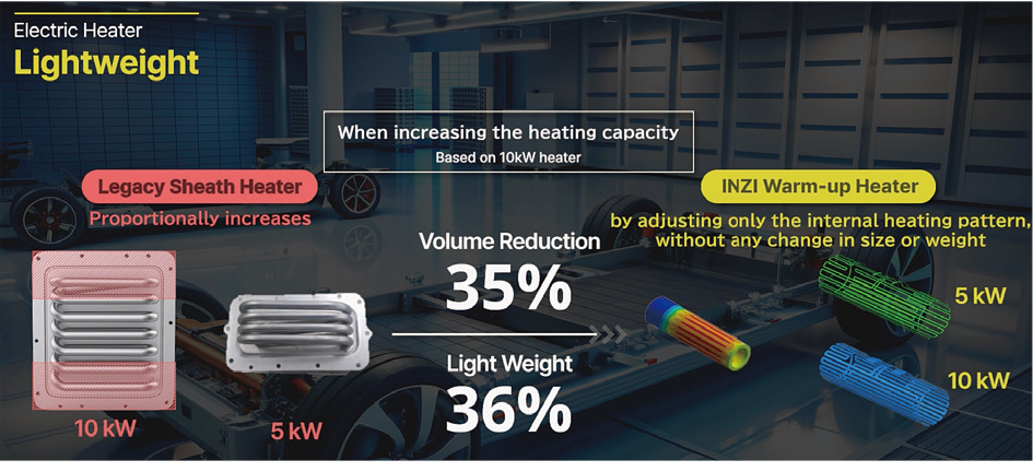 Also, when the capacity of the warm-up heater increases, the size of the heating element generally increases proportionally. However, the ceramic heater of INZI CONTROLS can respond to various capacities with the same volume by controlling the internal heating pattern. Moreover, INZI CONTROLS’ warm-up heater is 35% smaller in volume and 36% lighter in weight than the existing sheath heater.