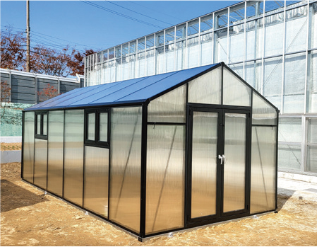 The panel of the prefabricated greenhouse is structurally safe and has excellent heat retention by adopting 10mm thick polycarbonate quadruple panel (three layers of air). In addition, it is treated with anti-UV coating and anti-fog to guarantee quality for more than 10 years.