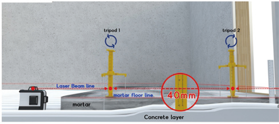 Screed leveling tripod is used for floor construction of mortar used for plastering inside buildings at construction sites. It is a device for checking the pouring height of the liquid mortar of the self-leveling mortar that is supplied as ready-mixed concrete and mixed on-site using a pump machine, or in bags to construct the floor evenly. This product is used together with a laser leveler and tapeline.