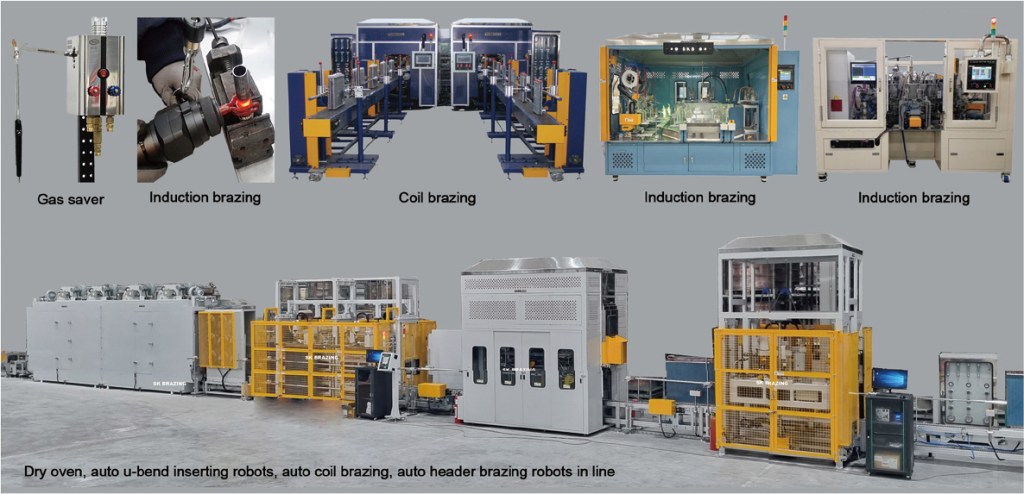 Now SK Brazing’s current complete range of brazing services includes: auto induction/laser/resistance brazing machines; auto distributer/header brazing machines; manual brazing equipment like gas savers; various brazing education & consulting services; coil brazing lines from dry ovens; U-bend inserting robots; coil brazing; and header brazing robots in line.