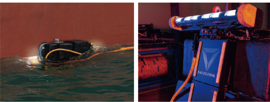 TAS GLOBAL has recently developed new technology to remove hull attachments by combining a robot’s underwater autonomous navigation technology and deep learning-based hull-structure analysis technology. Its ship hull cleaning ROV is the world’s only ROV that attaches strongly and gently to ships both underwater and on the surface of the water, and that can freely move and clean curved surfaces.
