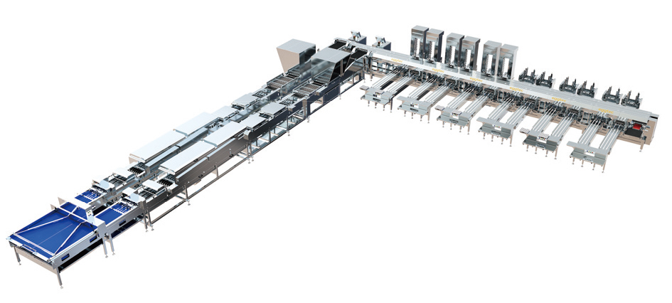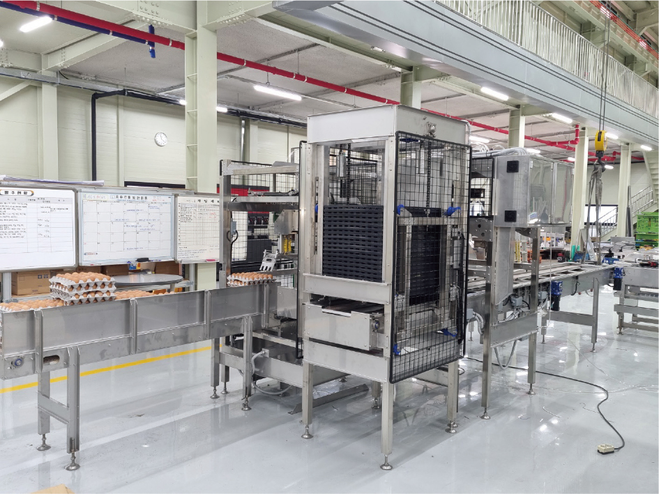 It is a system device that washes, dries, pasteurizes and oil-coats eggs transferred from an egg gathering conveyor to find filthy eggs, abnormal eggs (abnormal egg detector), or cracked eggs (Egg Crack Detector) and sorts them by weight to put them on 30 pack, 18 pack, 15 pack, 12 pack, and 10 pack egg trays.