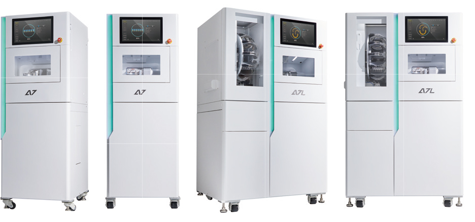 The A7L model of the A7 series is equipped with an automatic loader, enabling continuous machining for 24 hours a day, with up to 12 jigs continuously replaced. This 24-hour production capability allows even a small dental production unit to handle high-volume output, thereby significantly reducing labor costs. However, the A7 model uses manual jig replacement, limiting continuous machining.