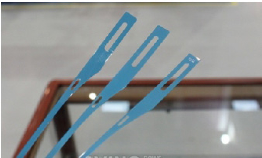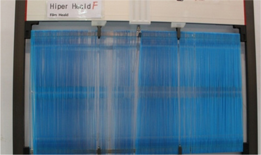 Plastic healds could not be combined with healds by catapulting under a thickness of 0.6m/m when trying the existing catapulting method. However, through one and a half years of hard work by NEGENTEC’s developers, they achieved catapulting under a thickness of 0.4m/m by a new production method, and as a result, NEGENTEC has succeeded in the manufacturing of plastic healds for the first time in the world and has come to manufacture the brand, HIPER HEALD.