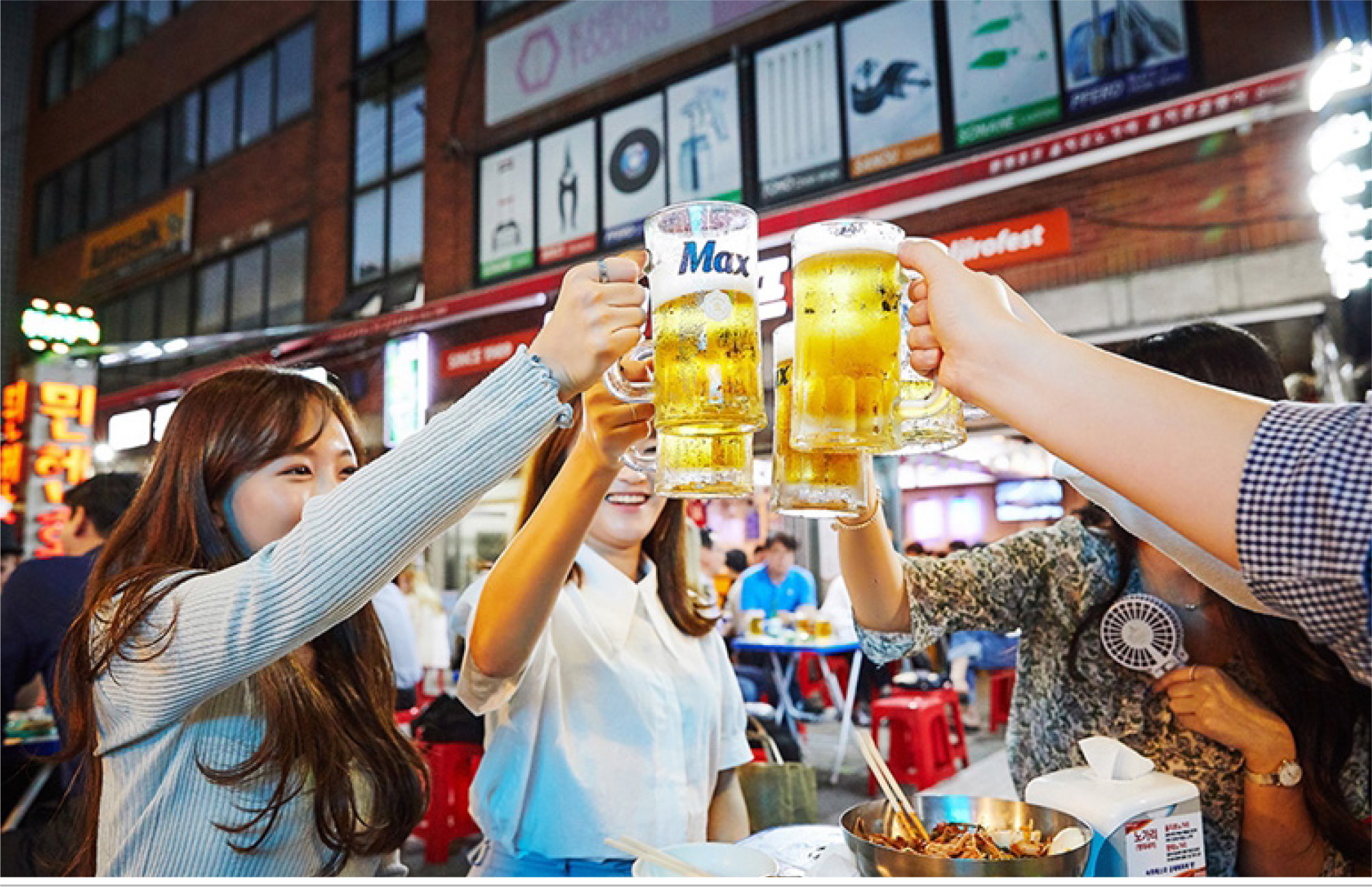Euljiro Nogari Street is perfect for beer lovers who want to enjoy beer and nogari at an affordable price. People sit on tables along the alley and enjoy the summer night.