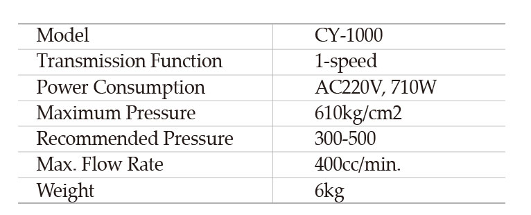 This product is a high pressure one component type automatic injector powered by electric motor. It is easy to carry and use at the site because of its light weight & compact design. Easy cleaning and maintenance are possible. And the exchange of the piston can be easily made.
