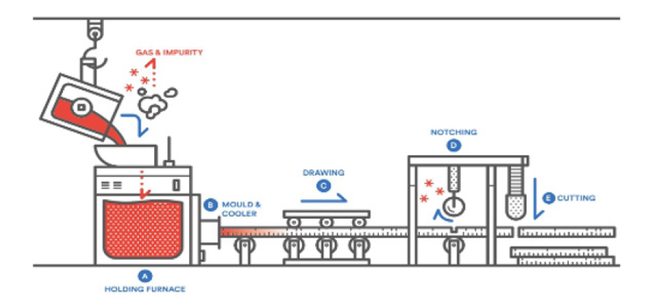 The molten iron held in the concast holder provides a large head of iron above the graphite die, thus reducing the risk of internal shrinkage defects in the pulled bar, whilst also allowing the lighter impurities in the iron to float upwards in the holder. This ensures homogenous material properties in the finished product.