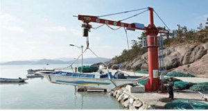 This product, mainly used in the abalone aquafarm, is a multipurpose articulated crane used for feeding, salvage of fishing net, kelp collection and abalone harvesting. This product has a multi-stage boom system and articulating outer boom with maximum lifting capacity and improved working radius based on the optimized design ranging from small to large vessels for responding to each aquafarm size and also is equipped with powerful hydraulic tongs enabling the precise operation, thereby demonstrating excellent capacity. This product is a vessel-dedicated crane equipped with components plated for preventing corrosion and various safety devices.
