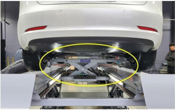 The center jack developed by Panstar Enterprise has the ability to expand to both sides, allowing the vehicle body to be lifted to the exact jack point on the side frame, thereby avoiding contact with the battery installed under the chassis of the electric vehicle.