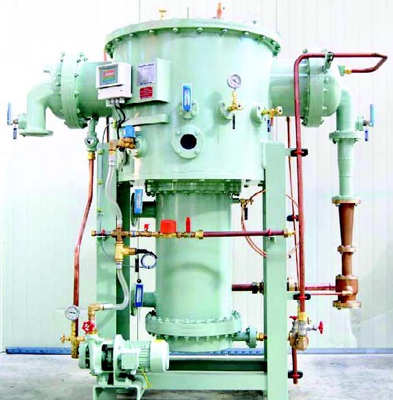 The vaporized seawater is desalinated in separate filtering unit before being condensed, and then fresh water is produced. Meanwhile, the salinity of produced fresh water shall remain at 0~10 ppm. The Fresh Water Generator is comprised of a vaporizer, condenser, demister, salinometer, distillate pump, ejector and steam injector. The Multi-stage Fresh Water Generator can achieve high efficiency when a large amount of fresh water is required with a small amount of calories due to lack of heat-source. This can be classified into MSF and MED type. Multi-stage Fresh Water Generator is manufactured under the license of CRC, United Kingdom.
