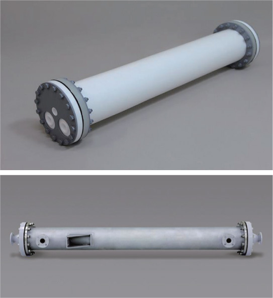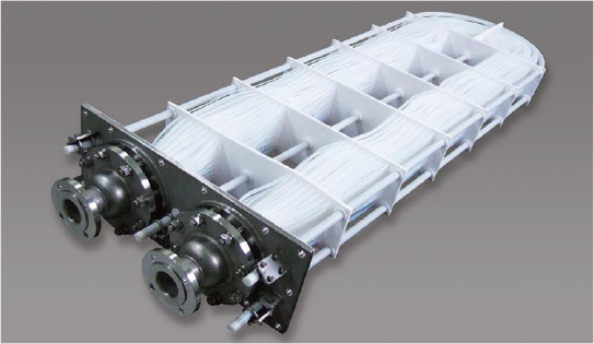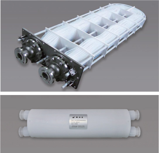 PTFE heat exchangers have excellent corrosion resistant qualities, these products are available in a wide variety of capacities and sizes to meet virtually any type of process heating and cooling a highly corrosive and high purity fluids. The perfect tube sheet structure applying patented fusion-welding technology makes it possible to endure high temperature and pressure (maximum use temperature and pressure: 90°C@5Kg/Cm2G).