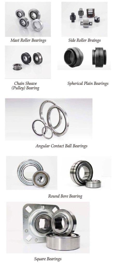 The mast roller bearings are used in heavy duty and shock loading to the Guide Roller during the vertical movement. And it is designed a suitable structure for forklift Mast. A deep groove ball bearing made of special applications. The load capacity is 0.5ton (1100 lb) ~ over 25ton (55,110 lb) for forklift mast.