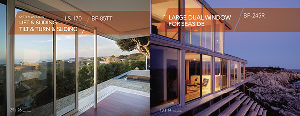 With a width of 115 mm, SIAN Co.’s “BF-115R2” large window frame is made with unplasticized PVC (U-PVC). Highly durable, the model is a European multi-functional type and has superb heat-insulating, soundproof properties. Its exterior part is available in colors of white, black or dark brown, while the interior part comes in a color of white, white oak, acacia, lyon walnut, white pearl and sonoma oak.