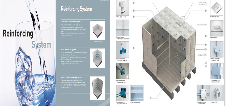 The interior structural components of a water tank consist of the Storage Tank System (STS) and Base Layer (STS PE Coating and Winding Pipes) that prevent corrosion or rusting. The external components are meltzinc plated, thus giving them a semi-permanent useful life. Special sealants with international patents are used to guarantee water tightness.Various panel designs are available to design tanks of all capacities and dimensions (L-shape, U-shape, square-shape). Standardized parts are used for on-site installation so that materials can be brought into restrictedareas for convenient installation.