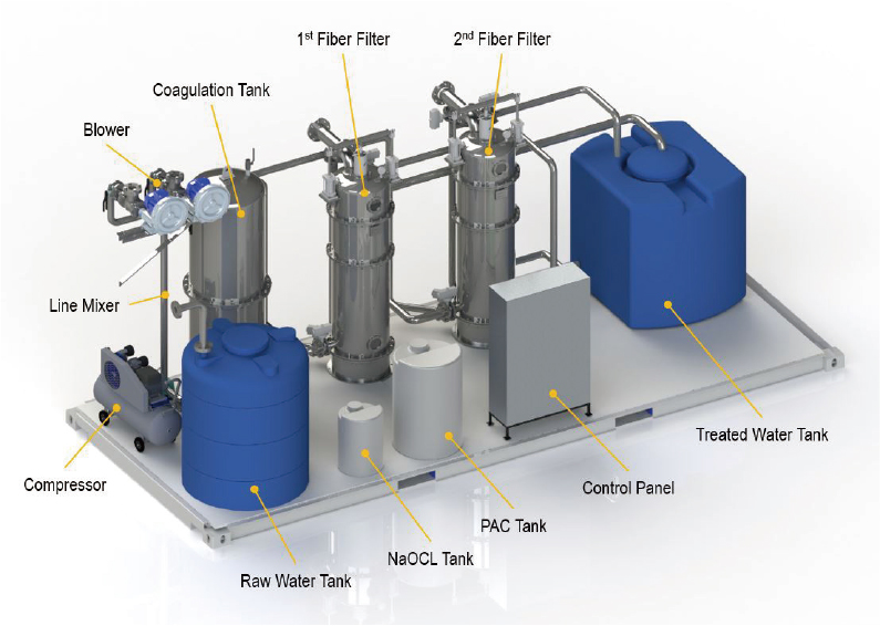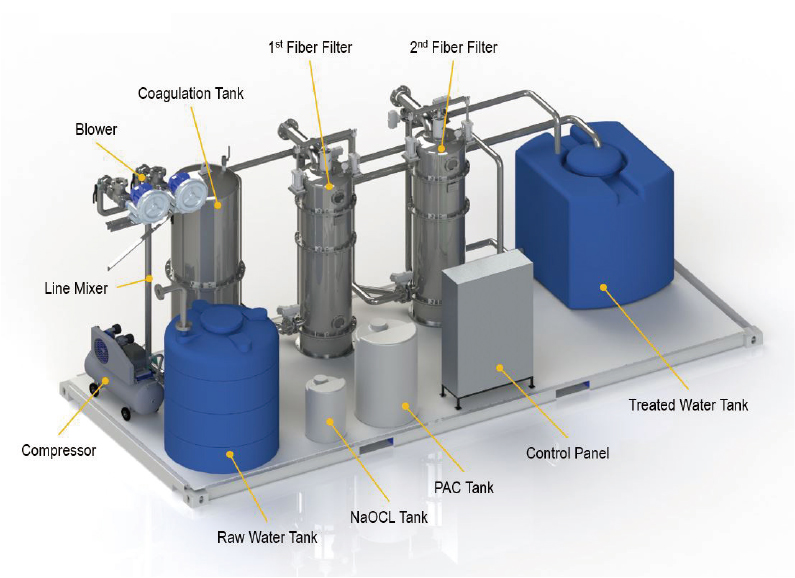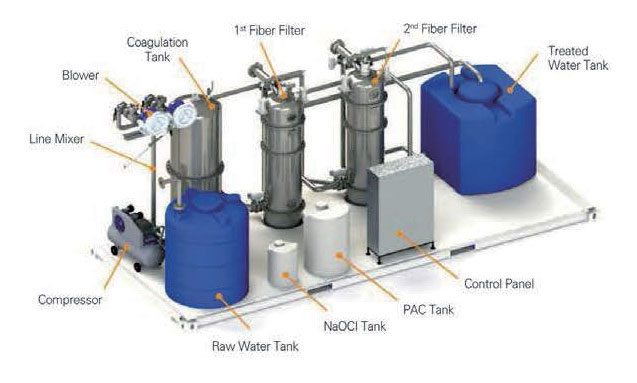 When proceeding with filtration, the fiber filter media is compressed to shrink the size of the pores in a way of filtering out the suspended solids in the raw water. When reaching the set pressure and time, the backwash is started to wash out the suspended solids that are attached to the fiber filter media by using backwash water and air.